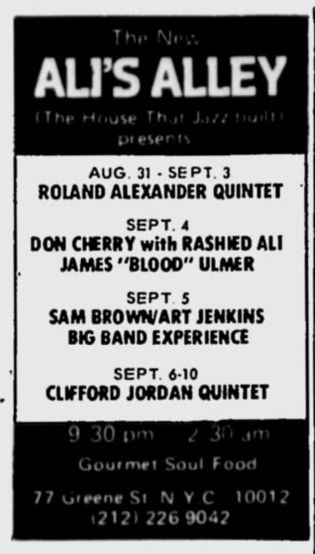 Enligt Urban Lasson filmade de sessionen med Don Cherry, Rashied Ali och James "Blood" Ulmer på eftermiddagen söndagen den 4 september. Med tanke på att konserten annonserades i The Village Voice var giget planerat sedan tidigare. Troligen är det den enda gången de spelade med varandra som trio.