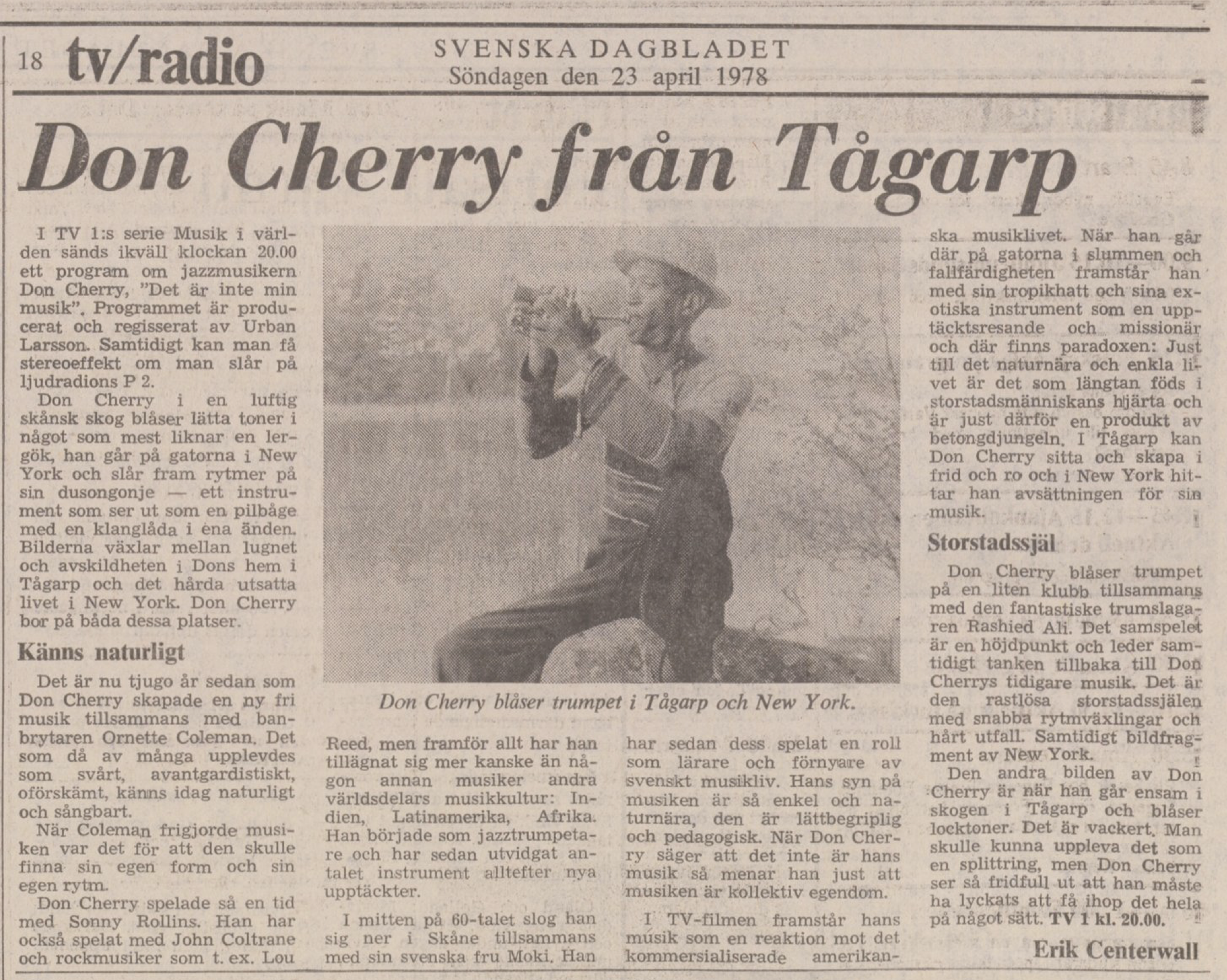 Forty-eight years ago today, the film Det är inte min musik (It's not my music) was shown for the first time on Swedish television. It is a wonderful film made by the filmmaker Urban Lasson. Through a geographical lens, he captures Don Cherry both in the old schoolhouse in Tågarp in southern Sweden and in his family’s loft in the big city of New York. It is the best film ever made about Don Cherry.